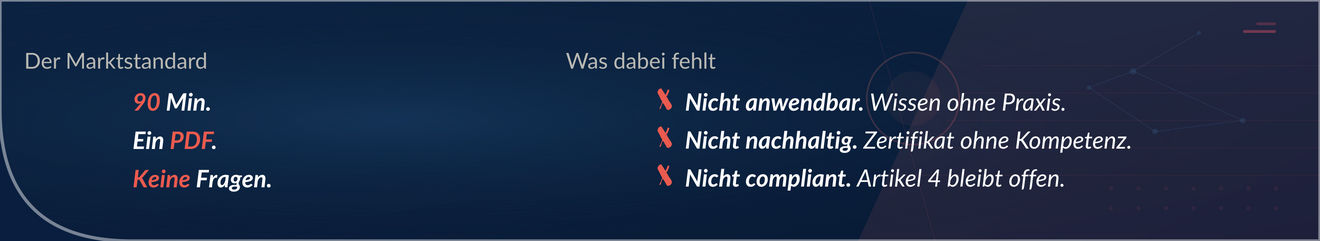 KI sicher zu nutzen, Risiken zu bewerten und Ergebnisse belastbar einzuordnen. Der KI-Führerschein verbindet technisches Verständnis mit Governance-Kompetenz und schließt damit die Lücke zwischen KI-Nutzung und EU AI Act Anforderungen. Am Ende steht nicht nur Wissen – sondern ein dokumentierter Kompetenznachweis.